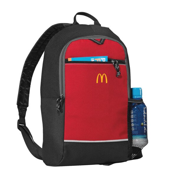 Arches Backpack Red/Black SKU: 12ABZ $10.99 Quantity discounts available QuantityPrice Quantity -+ Add to Shopping Cart Print Details Sturdy 600D Polyester. Zippered main compartment plus zippered front pocket, side mesh water bottle pocket and adjustable straps. 11" W x 18" H x 4"... Details Back DetailsSturdy 600D Polyester. Zippered main compartment plus zippered front pocket, side mesh water bottle pocket and adjustable straps. 11" W x 18" H x 4" D.