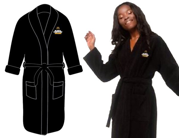 Black & Positively Golden Robe SKU: 9BPGR $39.99 Quantity discounts available QuantityPrice Quantity -+ Add to Shopping Cart Print Details 100% microfiber polyester fleece fabric, shawl collar, two pockets and a self-fabric belt. One size fits most, 48" long. This item has been discont... Details Back Details100% microfiber polyester fleece fabric, shawl collar, two pockets and a self-fabric belt. One size fits most, 48" long. This item has been discontinued and will not be reordered