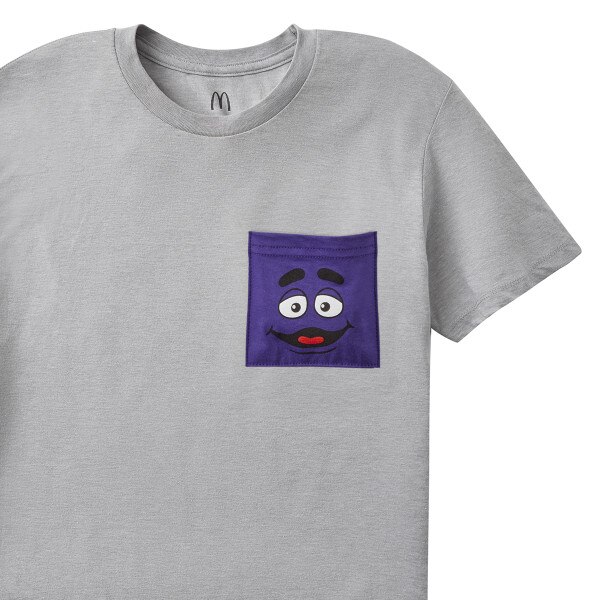 Grimace Pocket T-Shirt SKU: 1PGT Order Grid Summary 0 Subtotal$0.00 Add 0 items to Cart Print Details Super-soft heather grey T-Shirt with custom purple pocket printed with Grimace’s face. Custom McDonald’s woven red tag with arches on sleeve. 60... Details Back DetailsSuper-soft heather grey T-Shirt with custom purple pocket printed with Grimace’s face. Custom McDonald’s woven red tag with arches on sleeve. 60/40 cotton/poly blend. Unisex sizes. S – 3X. Please add $3.00 for sizes 2X-3X