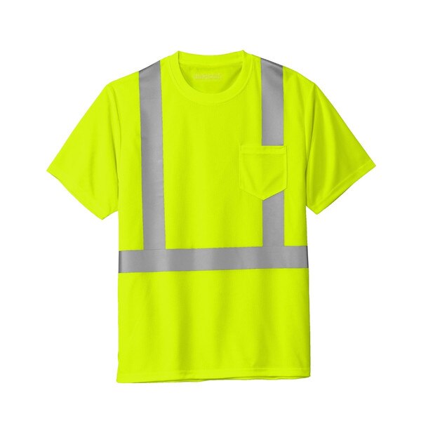 This breathable, moisture-wicking mesh tee delivers high visibility and on-the-job comfort. 4.1-ounce, 100% polyester. Durable, reflective 2-inch tape meets ANSI 107 requirements and provides 360-degree visibility on body. Left chest pocket. No McDonald's branding.