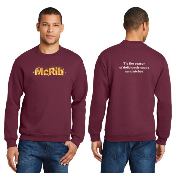 McRib Sweatshirt SKU: 1RIB Order Grid Summary 0 Subtotal$0.00 Add 0 items to Cart Print Details 7.8-ounce, 50/50 cotton/poly fleece. Air jet yarn for softness. Heat transfer McRib decoration on front and screenprint on back. Unisex sizes S - 3X (... Details Back Details7.8-ounce, 50/50 cotton/poly fleece. Air jet yarn for softness. Heat transfer McRib decoration on front and screenprint on back. Unisex sizes S - 3X (50+ $21.99 each)