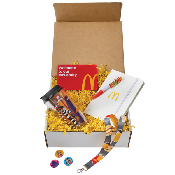Welcome new employees with an exciting gift box full of McDonald's Merch! Keep some on hand or let us ship it directly to your remote workers. Includes: 16oz. clear plastic, double-wall, insulated tumbler with snap on lid with easy flip-top opening, 5"x7" Executive Journal with 80 ruled pages, pen loop, bookmark ribbon, back cover paper pocket and elastic strap, Food Icon Lanyard, Food Icon Clip Pen, Set of 3 Vintage Mini Character Buttons and Welcome Card