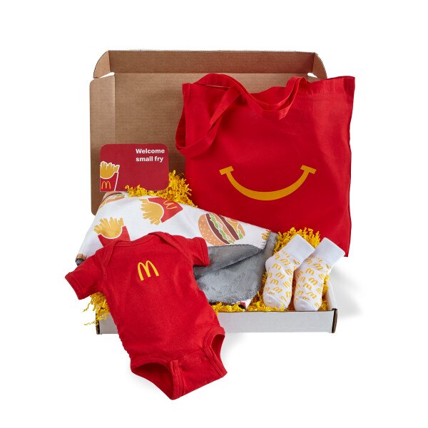 Shower the soon-to-be, or new parent with fun McDonald's Merch! Perfect for in-office or virtual celebrations. Includes: Bic Mac/Fry Blanket: 36" x 58" Ultra soft, micro-mink polyester. Big Mac/Fry Pattern with grey reverse side. Smile Tote: 15"x15" lightweight cotton. Slim design. Infant Onesie: 100% combed ring spun cotton. Infant socks Welcome Card