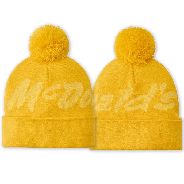 Script Yellow Knit Beanie with Pom SKU: 5GLD $11.99 Quantity discounts available QuantityPrice Quantity -+ Add to Shopping Cart Print Details Subtle retro McDonald's logo knit into hat. Super soft and stretchy. Details Back DetailsSubtle retro McDonald's logo knit into hat. Super soft and stretchy.