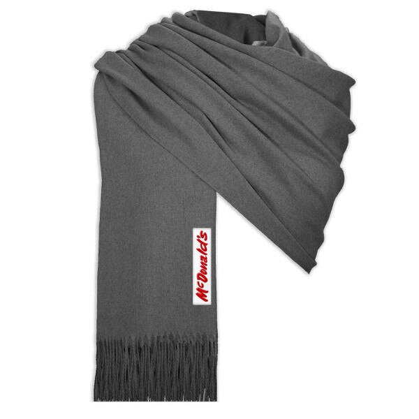 Soft Grey Pashmina SKU: 5SGP $19.99 Quantity discounts available QuantityPrice Quantity -+ Add to Shopping Cart Print Details Made from 100% viscose fabric, with an incredibly soft cashmere-like feel. 26" x 75" Custom woven McDonald's label stitched to edge. Dark grey. Details Back DetailsMade from 100% viscose fabric, with an incredibly soft cashmere-like feel. 26" x 75" Custom woven McDonald's label stitched to edge. Dark grey.